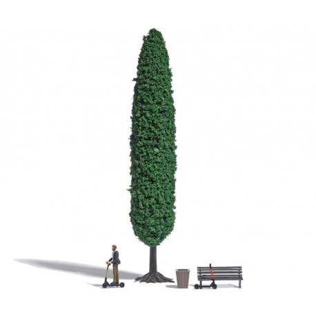 Zwei E-Scooter, einer davon mit Fahrer. Mit Parkbank, Papierkorb und Pappel..
