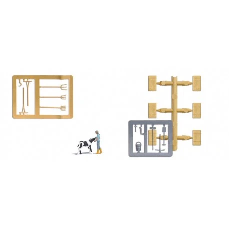 Action Set für die realistische Belebung Ihrer Modellwelt. Bäuerin, die ein Kalb mit der Milchflasche füttert. Mit Heuballen und Stallwerkzeug..
