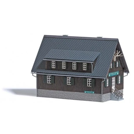 Forstamt in klassischer Holzbauweise. Wände, Dachgaube, Tür und Klappläden sind in diesem Bausatz aus echtem Holz gefertigt. Realistische Darstellung des Natursteinsockels. Mit Hirschgeweih an der Eingangsseite des Gebäudes. Alle Teile fertig koloriert. Passende Beschriftungen enthalten. Beleuchtbar mit Busch LEDs 5998. Größe: 136 x 78 mm, Höhe: 92 mm. Durch einen stabilen, zusammensteckbaren Unterbau, der mit den fertig geschnittenen und kolorierten Holzteilen verkleidet wird, ist der Zusammenbau besonders einfach. Zusätzlich sind lediglich ein Bastelmesser und Modellbaukleber (z.B. Busch 7599) oder Alleskleber (z.B. UHU® Kraft) erforderlich..