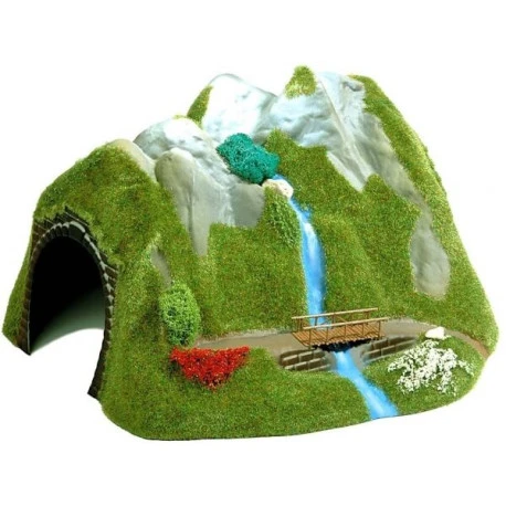 Mit Wasserfall und Holzbrücke für gebogene Strecken. Für Gleise mit Radien von 500-650 mm Maximale Innenhöhe des Portals: 93 mm Größe: 31 x 28 cm, 18 cm hoch Durch die spezielle Busch Grasimitation (gleiche Farb- und Materialstruktur wie Busch Geländeteppiche maigrün) ergeben sich Kombinationsmöglichkeiten mit selbstgestalteten Geländeabschnitten und mit anderen Busch Landschaftsteilen, Auffahrten usw.
