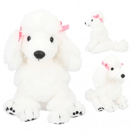 Supersüß und kuschelig weich: Der weiße Plüsch-Pudel Chanel hat schwarze Knopfaugen und an jedem Ohr ein rosa Schleifchen. Material: 100 Prozent Polyester.