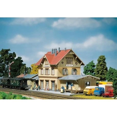 Typischer Standardbahnhof mit angebautem Güterschuppen, überdachter Wartehalle und separat stehendem Sanitärgebäude..