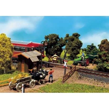 “Feldwegübergang mit Schrankenwärterhaus und beweglichen Schlagbäumen.Für alle geraden oder gebogenen Modellgleise.“.