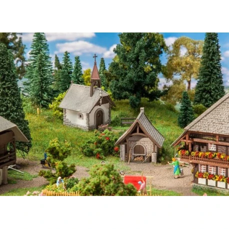 Ländliches Ensemble bestehend aus einer teilverputzten Kapelle mit einem kupfernen Glockenturm auf Balken sowie einem Backhäuschen mit großem Ofen. Beide Modelle mit schindelgedeckten Natursteinmauern auf quadratischen Grundrissen.
