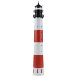 “Wahrzeichen des Nordens. Nachbildung des 1908 in Betrieb genommenen Leuchtturms »Westerheversand« auf der Halbinsel Eiderstedt in Schleswig-Holstein. Der rot-weiß geringelte Watt-Riese, der sich im Inneren über neun Stockwerke erstreckt, gilt als der bekannteste Leuchtturm Deutschlands.Das Modell ist mit einem in regelmäßigen Abständen leuchtenden See- und Orientierungsfeuer (Blitzfeuer) ausgestattet. Der Anschluss erfolgt an 12-16 V, Gleichspannung.“.