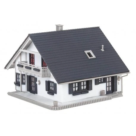 Einstöckiges Wohnhaus mit hell verputzter Fassade, weißem Holzbalkon und Giebelfenstern im Dachgeschoss..