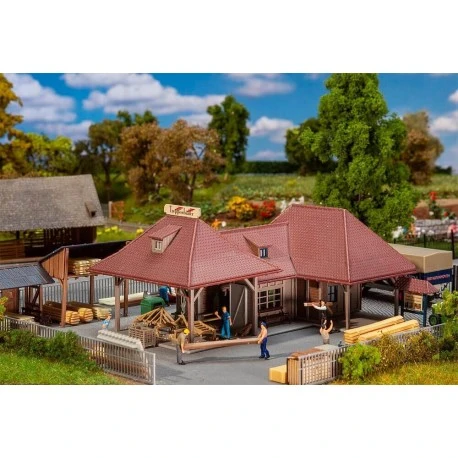Werkstattgebäude eines Treppenbauers mit überdachtem Vorbau und einem rückwärtigen Spänebunker. Für die Ausstattung der Schreinerei liegen eine Laufkatze, eine Kreissäge, zahlreiche Bretterstapel und weiteres Zubehör bei..