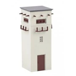 Hellgrau verputzter Trafoturm mit quadratischem Grundriss, einem Flachdach und eingelassenen Stahlträgern mit Isolatoren, die sich wie die Türe, farblich abheben. Der Bausatz besteht aus einem Materialmix aus Kunststoff und Spezialkarton..