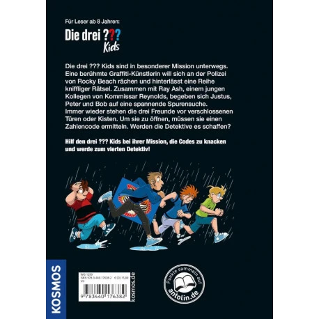 Justus, Peter und Bob sind beste Freunde und Detektive! Zusammen haben die drei ??? schon viele knifflige Fälle gelöst. Eine berühmte Graffiti-Sprayerin will sich an der Polizei von Rocky Beach rächen und hinterlässt überall in der Stadt knifflige Rätsel. Zusammen mit Ray Ash, einem jungen Kollegen von Kommissar Reynolds, begeben sich die drei ??? Kids auf Spurensuche. Und auch die Leserinnen und Leser sind hautnah dabei, denn nur mit ihrer Hilfe können die Detektive die Codes knacken und den Fall lösen.