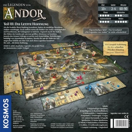 Das Spiel schließt an die Geschehnisse von Teil II Die Reise in den Norden und Chada & Thorn an. Die Helden sind zurück und müssen die verschleppten Bewohner Andors retten. Sie machen sich in den Süden des Landes auf und treffen dort auf ihr größtes Abenteuer. Jenseits des Grauen Gebirges erwarten die Spieler hinterhältige Skelettarmeen, befehligt von riesenhaften Krahdern. Werden die Helden, ausgestattet mit den vier magischen Schilden aus alter Zeit, auch diese Legenden bestehen? Inhalt: 1 großer, doppelseitiger Spielplan, 40 Spielfiguren in Kunststoffhaltern, 4 Heldentafeln, 1 Ausrüstungs-/Kampftafel, 142 Kartonteile, 1 Tross-Wagen, 144 große Spielkarten, 33 kleine Spielkarten, 25 Würfel, 10 Holzscheiben, 6 Holzsteine, 1 Erzähler, 15 Sortierbeutel, 1 Losspiel-Anleitung, 1 Begleitheft.