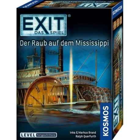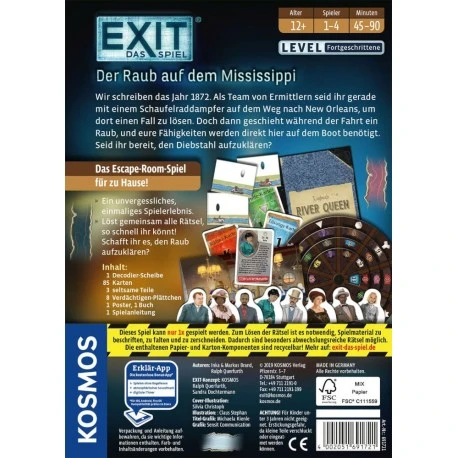 Im EXIT® Spiel „Der Raub auf dem Mississippi findet ihr euch in einer spannungsgeladenen Story wieder: Schlüpft in die Rollen von Detektiven auf einem Mississippi-Dampfer. Der Kapitän braucht Hilfe, um einen Raub an Bord aufzuklären. Möglichst schnell müsst ihr es gemeinsam schaffen, den Dieb zu überführen, bevor dieser das Schiff verlassen kann. Wird der Täter geschnappt, ehe sie im Zielhafen New Orleans ankommen? Mit der Reihe „EXIT® – Das Spiel bringt KOSMOS das Gefühl der Live-Escape-Rooms zu euch nach Hause. Jede Box bietet einer Gruppe von 1 bis 4 Personen ein außergewöhnliches Spielerlebnis für einen einmaligen und absolut unvergesslichen Abend! Der Wettlauf gegen die Zeit und die cleveren Rätsel dieser innovativen Spielreihe sorgen für Spannung und geistige Herausforderung in den eigenen vier Wänden. Um die Rätsel zu lösen und sich somit gemeinsam aus der misslichen Lage zu befreien ist Teamgeist gefragt! Also arbeitet gut zusammen, denn die Zeit läuft… Live-Escape-Feeling im Fortgeschrittenen-Level. Inhalt: 1 Decodier-Scheibe, 17 Rätsel-Karten, 8 Verdächtigen-Karten, 30 Lösungs-Karten, 30 Hilfe-Karten, 3 seltsame Teile, 8 Verdächtigen-Plättchen, 1 Poster, 1 Buch, 1 Spielanleitung.