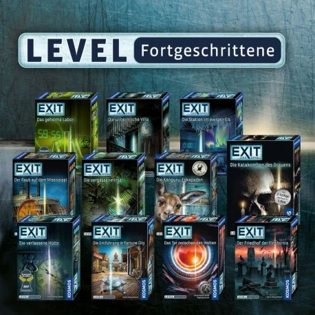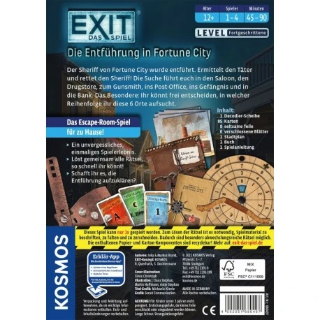 Mystery im Wilden Westen! Kriminelle Dinge geschehen in Fortune City und jetzt ist auch noch der Sheriff spurlos verschwunden. Euch bleibt nur wenig Zeit, um ihn zu finden! Quer durch den Ort, durch Saloon, Drugstore, Gunsmith, Post-Office, Gefängnis und Bank führt eure Suche. Das Besondere: Ihr könnt euch frei entscheiden, in welcher Reihenfolge ihr diese Orte besucht. Beim Lösen der cleveren Rätsel ist das ganze Team gefragt! Gemeinsam sammelt ihr Spuren, testet Zahlenkombinationen und wertet Zeugenaussagen aus. Die Spannung steigt! Und die Zeit drängt! Werdet ihr den Sheriff rechtzeitig befreien? Mit der Reihe „EXIT® – Das Spiel bringt KOSMOS das Gefühl der Live-Escape-Rooms zu euch nach Hause. Jede Box bietet einer Gruppe von 1 bis 4 Personen ein außergewöhnliches Spielerlebnis für einen einmaligen und absolut unvergesslichen Abend! Der Wettlauf gegen die Zeit und die cleveren Rätsel dieser innovativen Spielreihe sorgen für Spannung und geistige Herausforderung in den eigenen vier Wänden. Um die Rätsel zu lösen und sich somit gemeinsam aus der misslichen Lage zu befreien ist Teamgeist gefragt! Also arbeitet gut zusammen, denn die Zeit läuft… Live-Escape-Feeling im Fortgeschrittenen-Level. Inhalt: 1 Buch, 1 Decodier-Scheibe, 23 Rätsel-Karten, 30 Lösungs-Karten, 32 Hilfe-Karten, 6 verschlossene Blätter, 1 Stadtplan, 8 seltsame Teile, 1 Spielanleitung.