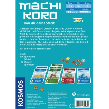 Würfeln, kassieren, investieren. Neue Gebäude bringen die nötigen Einnahmen. Doch soll man seine Investitionen lieber verteilen oder alles auf wenige Bauprojekte setzen? Der Bahnhof muss gebaut werden … und der Fernsehturm. Je mehr man baut, umso höher ist das mögliche Einkommen. So entsteht nach und nach vor jedem Spieler die eigene Stadt. Entscheidend ist, wer als Erster seine vier Großprojekte baut. Denn dieser Spieler gewinnt. Inhalt: 108 Karten, 2 Würfel, 72 Münzplättchen, 1 Spielregel.