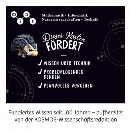 Ein schlauer Igel-Roboter, der auf Klatschbefehle reagiert – das ist Nuna aus der Roboterfamilie von KOSMOS. Mit dem Experimentierkasten konstruieren Kinder ab 8 Jahren einen Roboter, der es in sich hat. Dank des Sound-Sensors weiß der Igel genau, welche Bewegungen er ausführen soll. Er läuft, stellt die Stacheln auf und rollt sogar rückwärts! Die leuchtenden LED-Augen verraten, in welchem Modus sich der Igel-Roboter gerade befindet. Stecken, klicken, schrauben – das Zusammenfügen der 170 Einzelteile aus dem hochwertigen Bausatz fördert die Feinmotorik und planvolles Vorgehen und bietet viel Bauspaß. Die Anleitung zeigt detailliert und Schritt für Schritt, wie es geht. Mit einer Comic-Geschichte tauchen die Kinder in die Welt von Nuna, Izzy und Tom ein und erfahren spannendes rund um Roboter und ihre Mechanik. Inhalt: Bauteile zum Zusammenbau des Roboters inkl. vorprogammierte Platine mit Sound-Sensor, Motor und Getriebeteilen, Anleitung, Schraubendreher Zusätzlich wird benötigt: 4 x 1,5-Volt-Batterien Typ L R03 (AAA, Micro) Schere oder Seitenschneider, Feile.