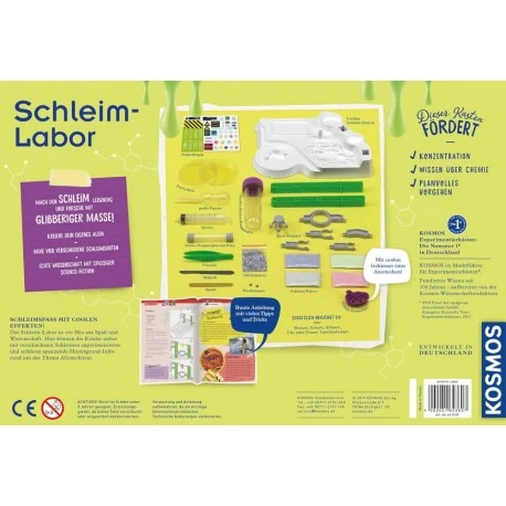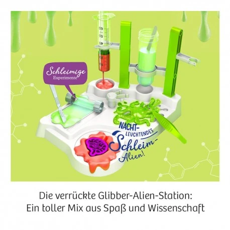 Nachtleuchtendes Schleim-Alien, Farbwechsel-Schleim, glibberige Gehirne einfach selber machen Schleim in allen Formen und Farben gibt es im Experimentierkasten Schleim-Labor von KOSMOS. An der Station aus robustem Kunststoff führen Kinder von 8 bis 13 Jahren tolle Experimente mit Pipette, Petrischale, Messbecher, Reagenzglas und Co. durch. Anrühren, ausrollen, ausstechen, durch eine Spritze drücken mit diesem ganz besonderen Glibber-Material wird Laborarbeit zum großen Spaß und ganz nebenbei lernen die Kinder den richtigen Umgang mit ihren ersten Labor-Utensilien kennen. Ausführliche Info-Texte erklären erste chemische Grundbegriffe, und die Anleitung beschreibt die einzelnen Schritte der Experimente anhand einer spannenden Alien-Forschungsmission. Übrigens: Der Experimentierkasten Schleim-Labor ist mit der großen Big Fun Chemistry-Station von KOSMOS kombinierbar. Los geht s mit den schleimigen Experimenten!.