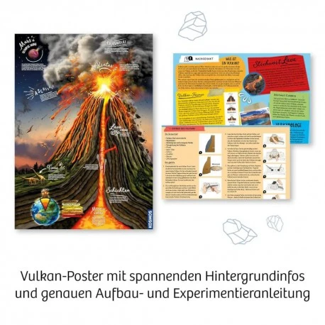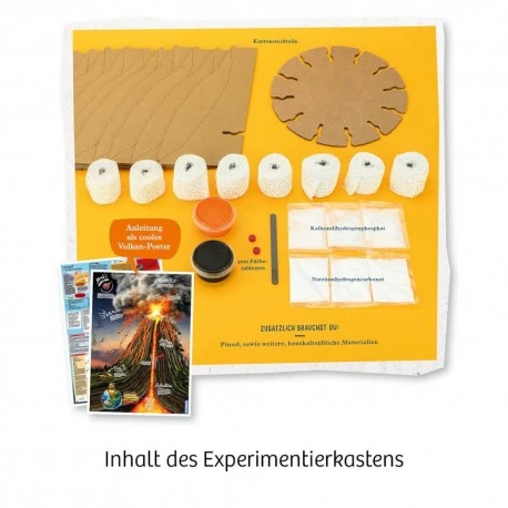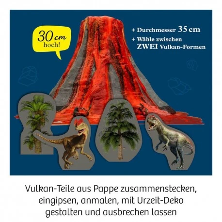 Urzeit-Atmosphäre im Kinderzimmer! Der gigantische Vulkan wird aus Pappteilen ganz einfach zusammengesteckt und mit Gips-Mullbinden eingewickelt. Dabei kann zwischen zwei verschiedenen Vulkan-Formen gewählt werden. Trocknen lassen, in schwarz und orange anmalen, und selbst gebastelte Lava-Steine und Aufsteller mit Pflanzen und Dinosauriern platzieren – schon kann der Ausbruch starten. Für die brodelnde Lava werden Chemikalien und Farbstoff zusammen gemischt – der KOSMOS Experimentierkasten von 8 bis 12 Jahren enthält genug Material für drei Eruptionen. Und das Beste: die Eruption kann beliebig oft mit Haushaltsmitteln wiederholt werden. Tolles Extra: die detaillierte Anleitung wird als Poster an die Wand gehängt – mit vielen Wissenstexten und einem spektakulären Vulkan-Bild..