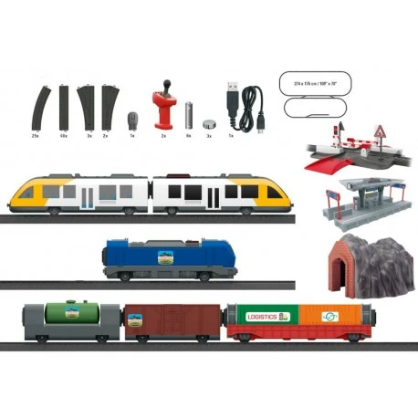 Modell: Beide Züge mit Akkuantrieb und Magnetkupplungen zwischen den einzelnen Wagen. Motoren, Akkus und die gesamte Elektronik sind für Kinder unzugänglich verbaut. Die Loks können mit dem mitgelieferten USB-Ladekabel aufgeladen werden. Jeweils 3 Geschwindigkeitsstufen bei Vorwärts- und Rückwärtsfahrt, 3 Soundfunktionen und ein Spitzensignal. Für den umfangreichen Einstieg in die spannende Welt der Eisenbahn liegt der Startpackung ein Tunnel, ein manueller Bahnübergang und ein Bahnsteig bei.Länge des Personenzugs 32,6 cm.Länge des Güterzugs 58,5 cm.Inhalt: 25 gebogene Kunststoffgleise, 40 gerade Kunststoffgleise, 3 Weichen links, 2 Weichen rechts und ein Prellbock. Für jeden Zug liegt ein kindgerechter Märklin Power Control Stick bei. Stickerbogen. Ein USB-Ladekabel, 6x AAA Batterien, sowie 3x LR44 Knopfzellen sind im Lieferumfang enthalten. Erweiterbar mit der Kunststoffgleis-Ergänzungspackung 23400.