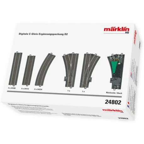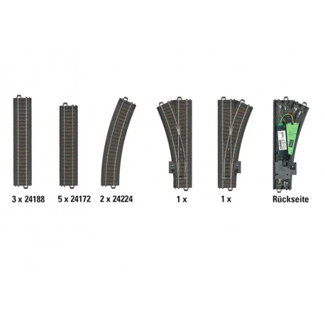 Inhalt: 3 gerade Gleise 24188, 5 gerade Gleise 24172, 2 gebogene Gleise 24224, 1 Weiche links 24611 und 1 Weiche rechts 24612, jeweils mit eingebautem Decoder und Antrieb. Aufbau- und Anschlussanleitung liegt bei.