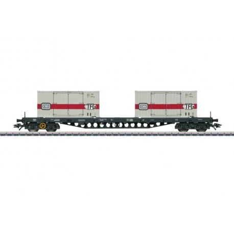 Modell: Drehgestelle Typ Minden-Siegen. Mit Feststellbremse (Handräder) an einem Drehgestell. Durchbrochener Tragwagen-Boden aus Metall. Tragwagen ist beladen mit 2 DB-Binnencontainern zum Abnehmen. Länge über Puffer 22,9 cm.Gleichstromradsatz E700580..